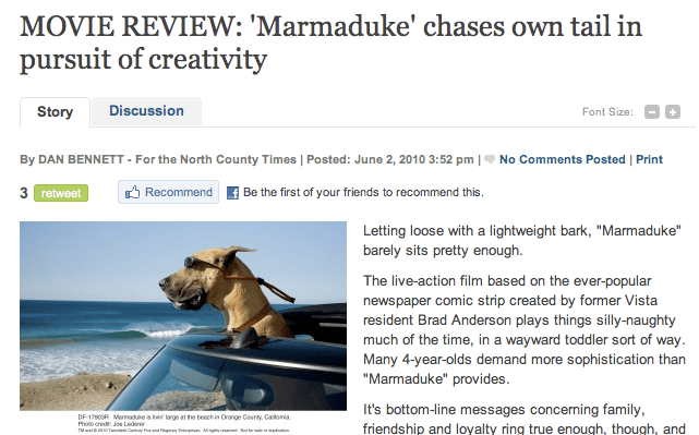 Nothing to “bark” about! 14 June, 201010 November, 2010 / emmasans / Leave a comment It’s Marmaduke week here at Bad Animal Puns! All Marmaduke reviews, all the time! Tune in every day this week for more Marmaduke reviews! (They’re not very good!)